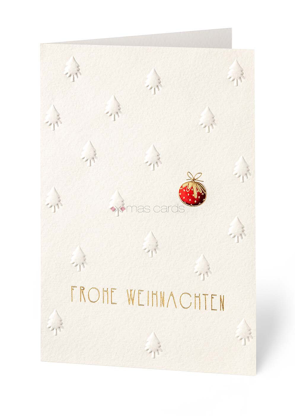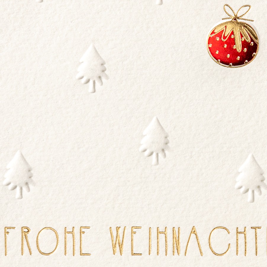 Eine schöne Blindprägung der Weihnachtsbäume mit funkelnder Weihnachtskugel in Rot und trendiger Schleife in Goldfolienprägung.