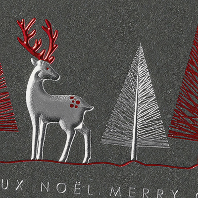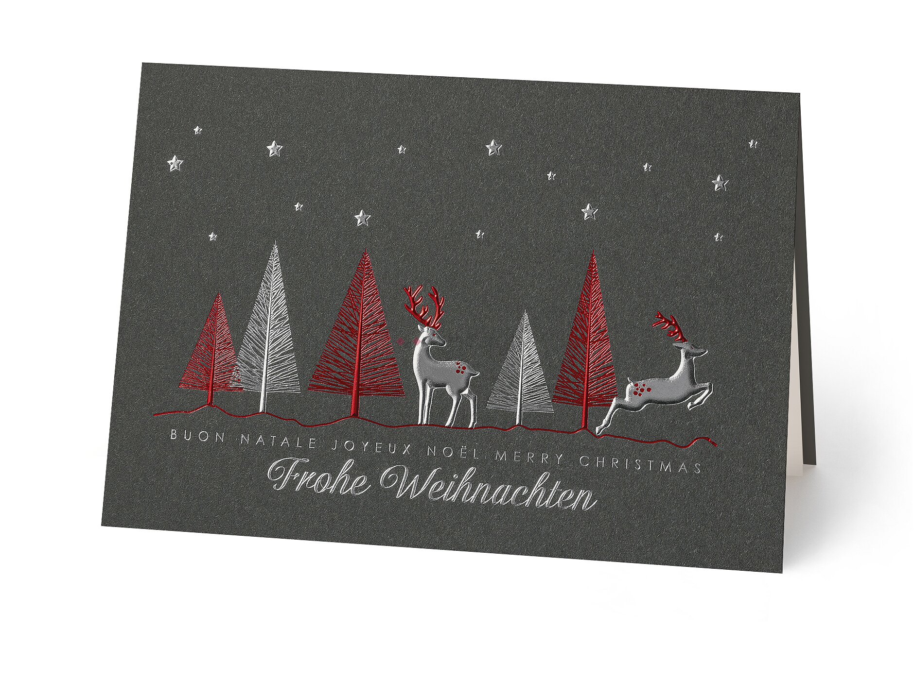 Weihnachtskarte aus anthrazitgrauem Feinstkarton und edler Rot- und Silberfolienprägung.