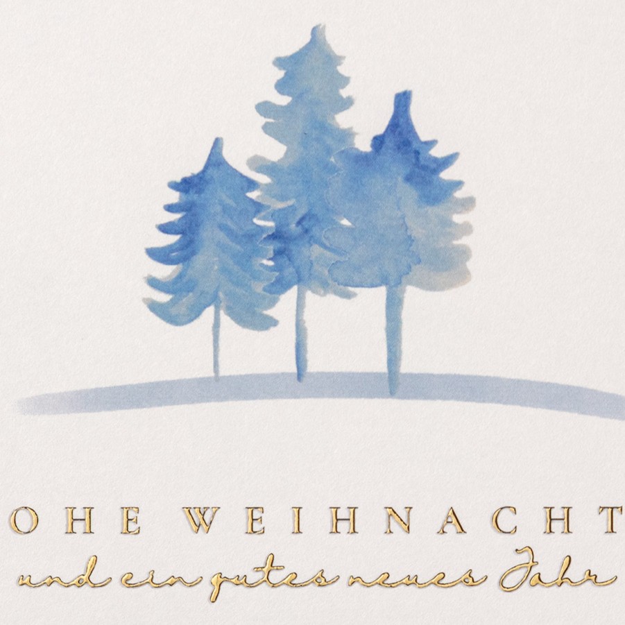 Blaue Weihnachtsbäume in Aquarell und einem Weihnachtsgruss in Goldfolienprägung auf weissem Feinstkarton.