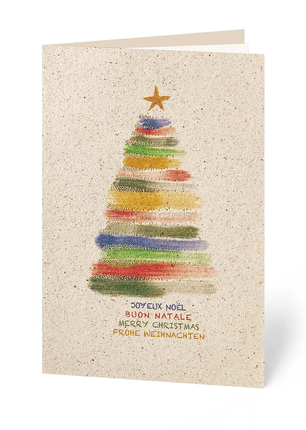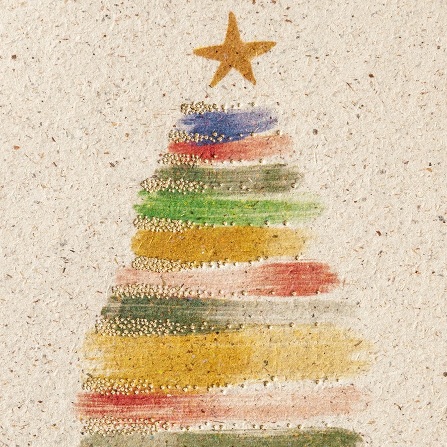 Diese Weihnachtskarte aus Graspapier mit edler Goldfolienprägung und buntem Weihnachtsbaum bringt Farbe in diese Jahreszeit.