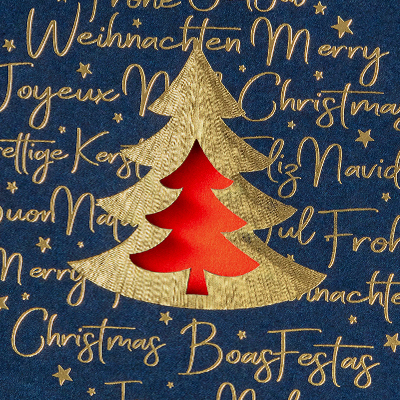 Internationale Weihnachtswünsche mit Goldfolienprägung auf dunkelblauem Feinstkarton. Der ausgestanzte Baum gewährt Einblicke auf die Vorderseite des Einlageblattes.