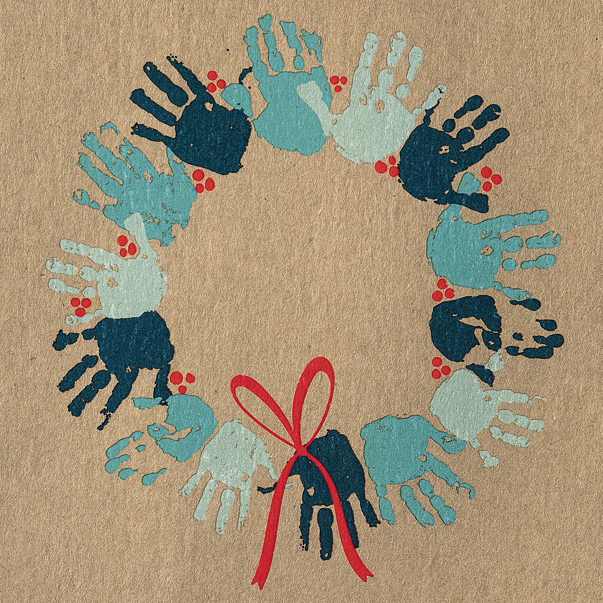Der moderne Weihnachtskranz mit farbenfrohen Händen zieht die Blicke bei dieser Weihnachtskarte auf sich.