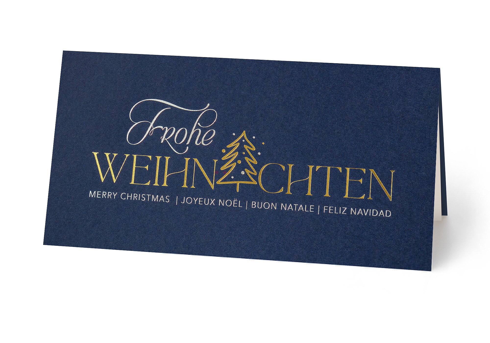 Internationale Weihnachtsgrüsse in festlicher Gold- und Silberfolienprägung auf dunkelblauem Feinstkarton.