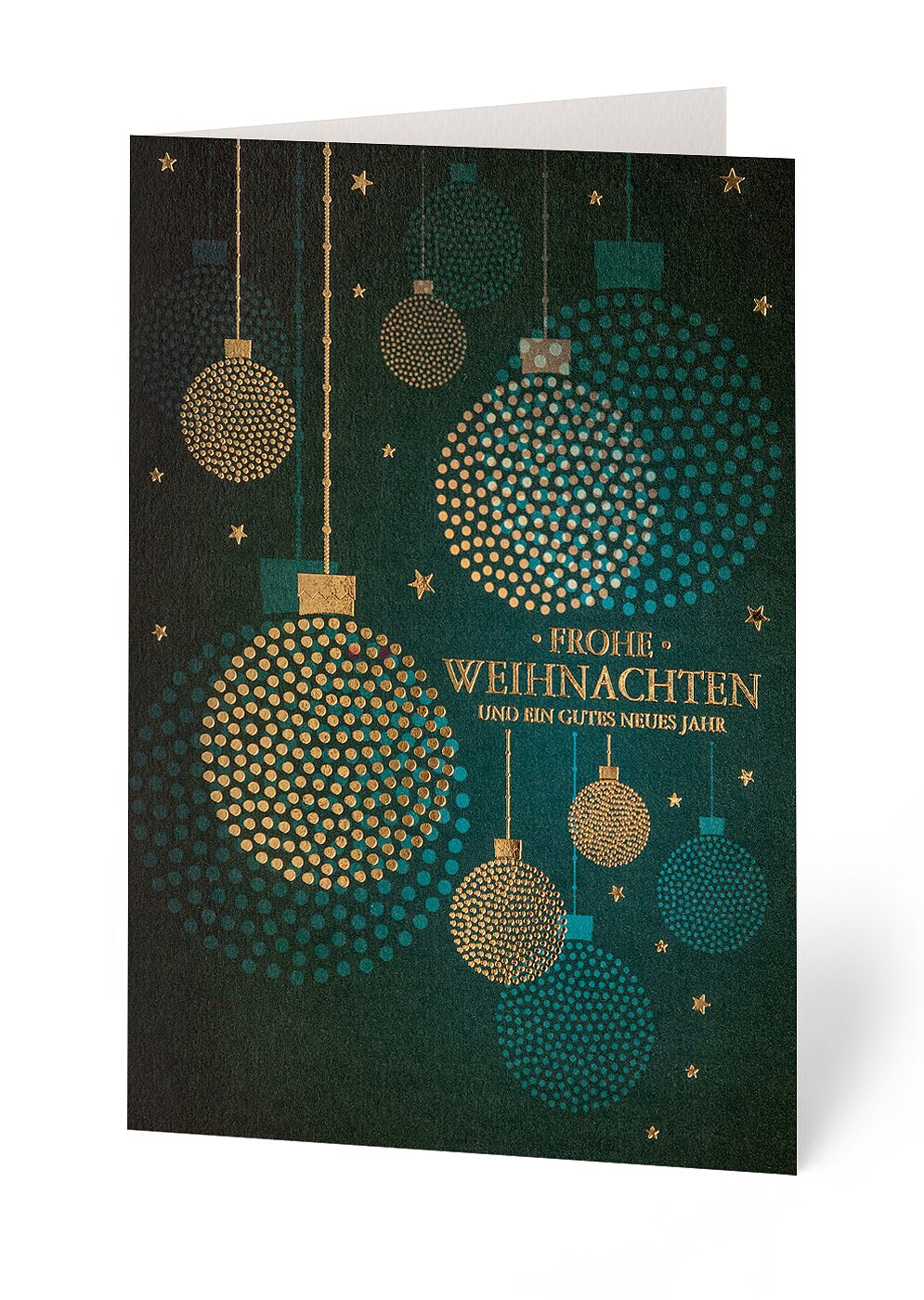 Eine Weihnachtskarte in tiefem Grün. Auf der Karte sind zahlreiche Weihnachtskugeln in verschiedenen Grössen verteilt, die mit einer edlen Goldfolienprägung verziert sind. Das goldene Glanzstück hebt die Kugeln wunderschön hervor und verleiht der Karte einen festlichen, luxuriösen Eindruck.