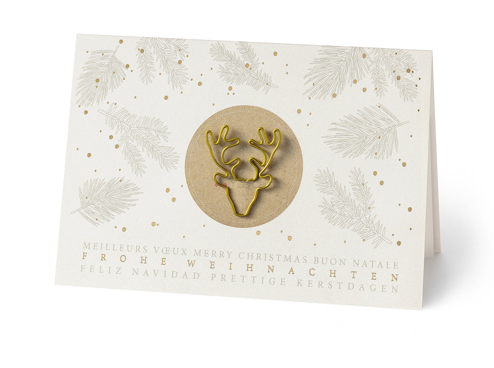Hochwertiger Druck und Goldfolienprägung mit Zweigen und Wünschen auf hellem Strukturkarton. Die goldene Hirschklammer macht diese Karte zu einem echten Hingucker.