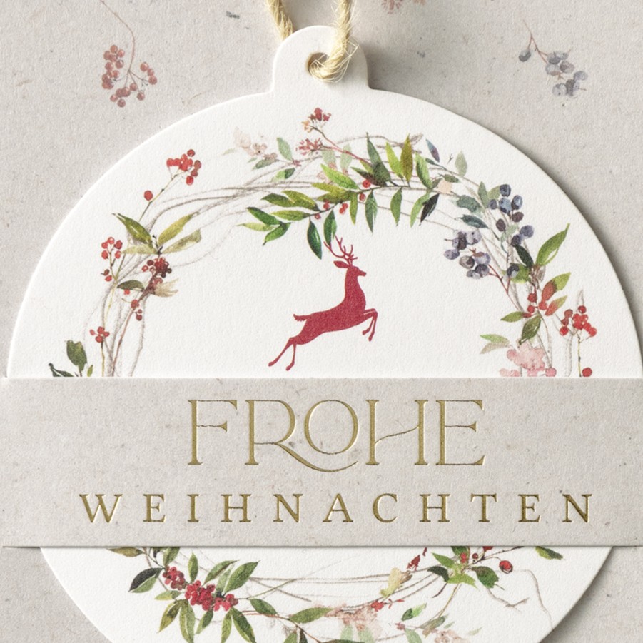 Diese charmante Weihnachtskarte ist mit liebevoll gestalteten Blättern verziert, die eine natürliche und elegante Atmosphäre schaffen. Im Mittelpunkt steht eine festliche Weihnachtskugel, die eingesteckt ist. Die Kombination aus den Blättern und der farbenfrohen Kugel verleiht der Karte eine harmonische und festliche Ausstrahlung.