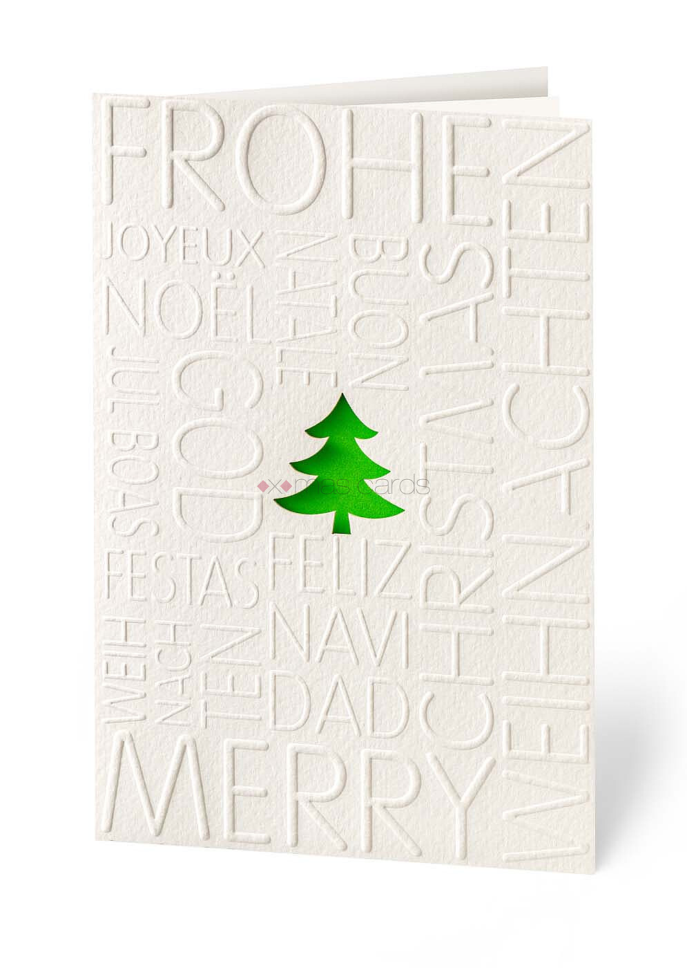 Moderne Typografiekarte mit weihnachtlichen Wünschen. Die Laserstanzung des Baumes gewährt Einblick auf die Vorderseite des Einlageblattes.