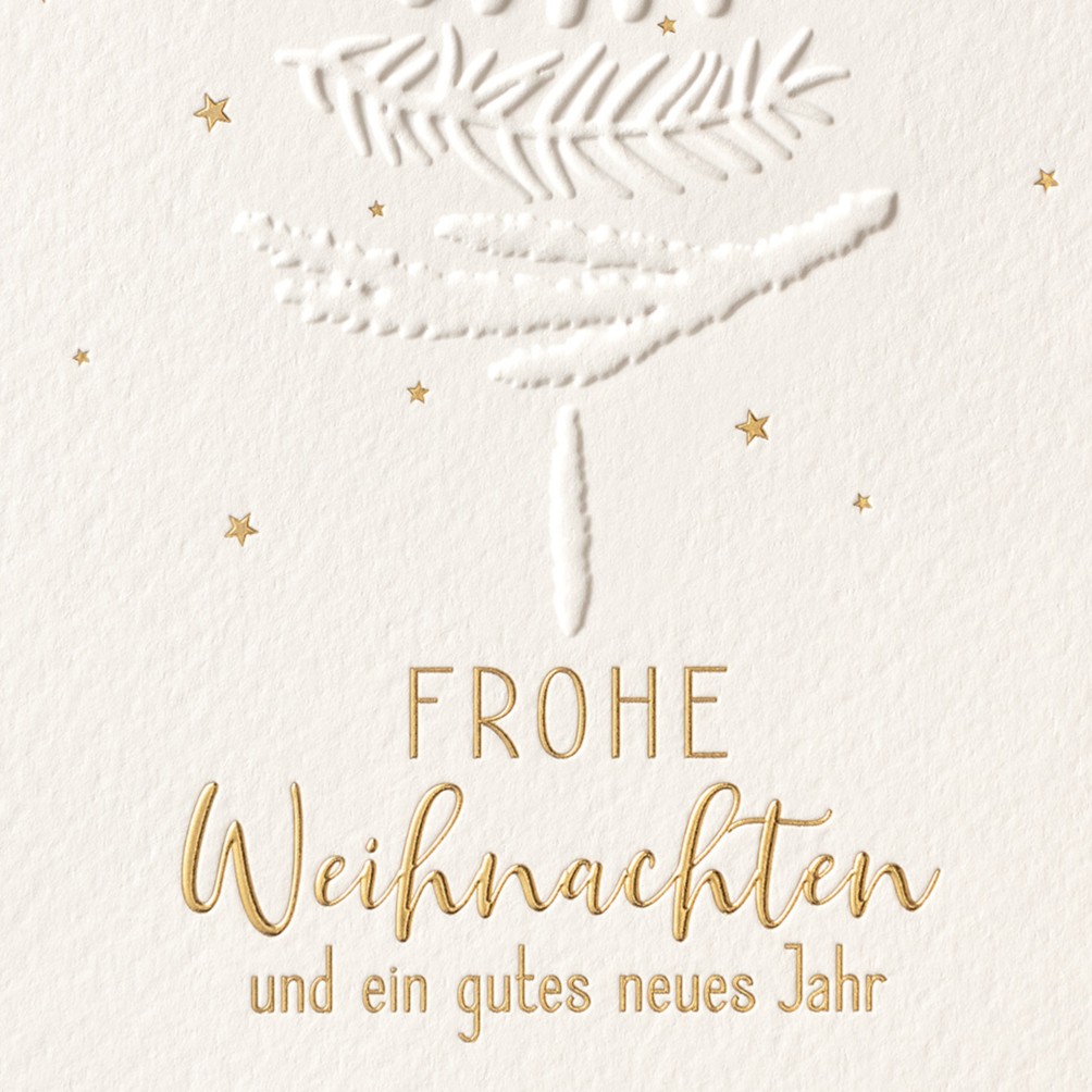 Weihnachtsgruss mit Blind- und Goldfolienprägung auf hellem Strukturkarton.