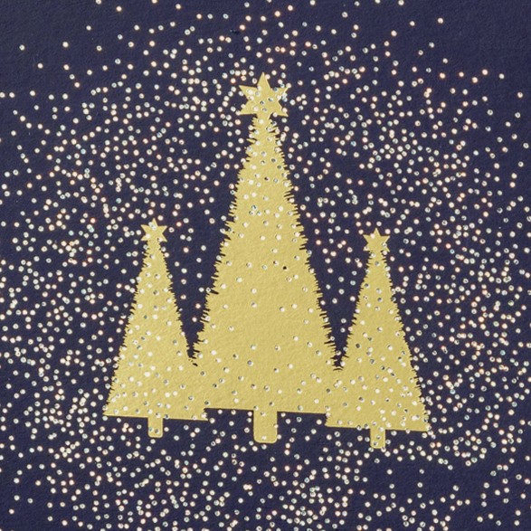Die verzauberte Weihnachtsbäume in Silberglimmer- und Goldfolienprägung auf dunkelblauem Feinstkarton übermitteltn festliche Wünsche.