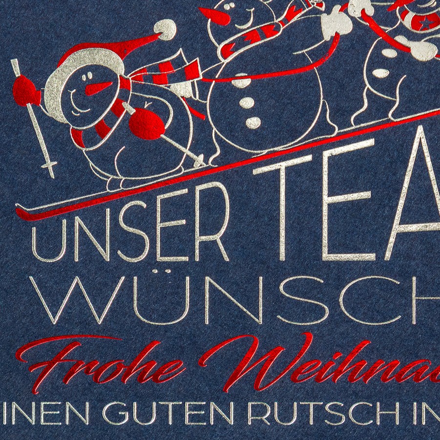 Eine humorvolle Teamkarte mit Weihnachts- und Neujahrswünschen in Rot- und Silberfolienprägung auf dunkelblauem Feinstkarton.
