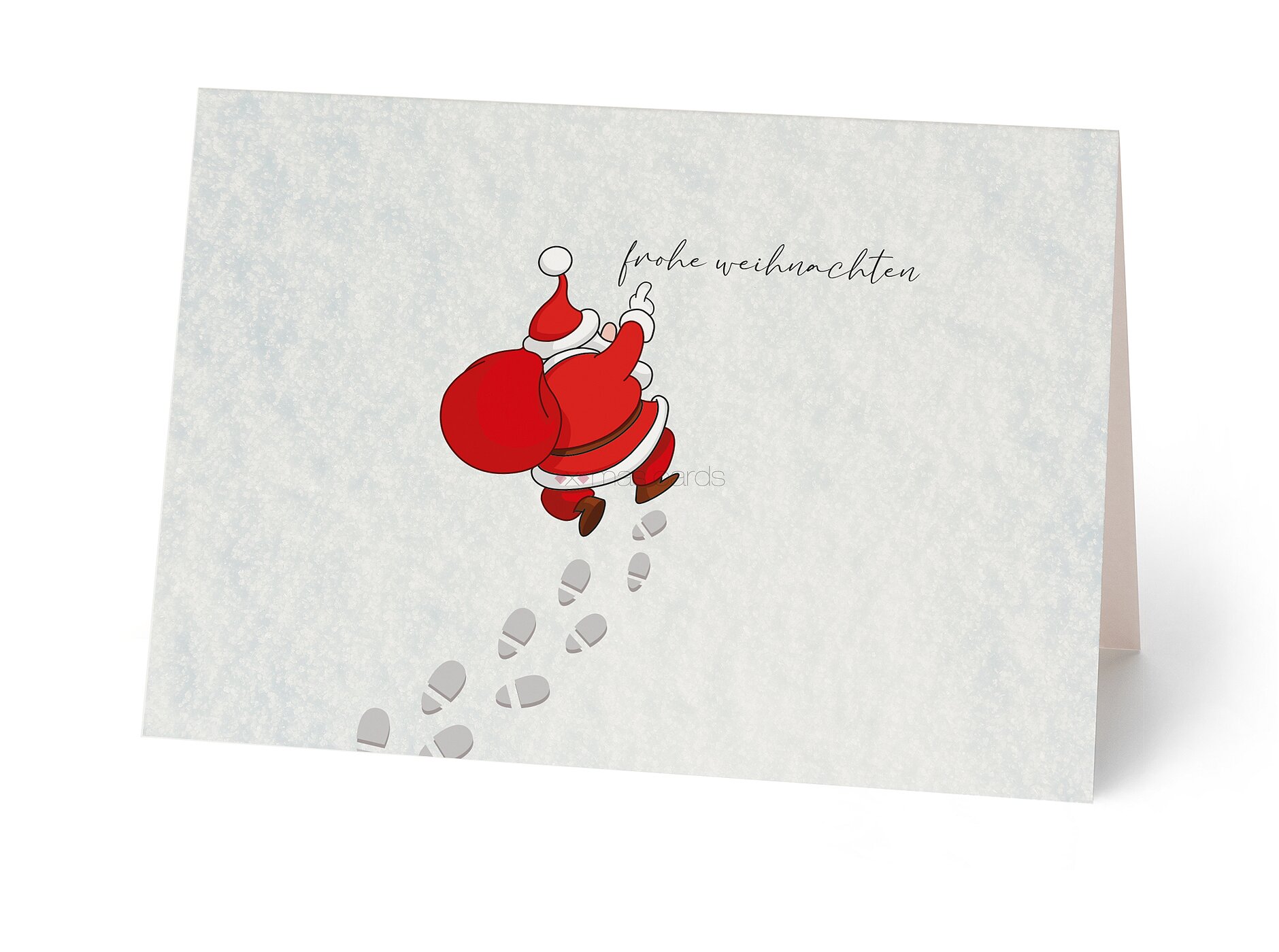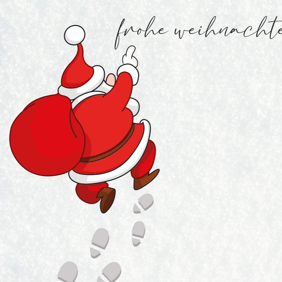 Ein fröhlicher Weihnachtsmann in seinem roten Anzug stapft durch eine verschneite Winterlandschaft. Der Schnee glitzert im Licht, und im Vordergrund sind frische Fussspuren im Schnee zu sehen, die den Weg des Weihnachtsmanns markieren. Diese Karte vermittelt eine warme, festliche Stimmung und lädt dazu ein, die Weihnachtszeit mit Freude und Magie zu feiern.