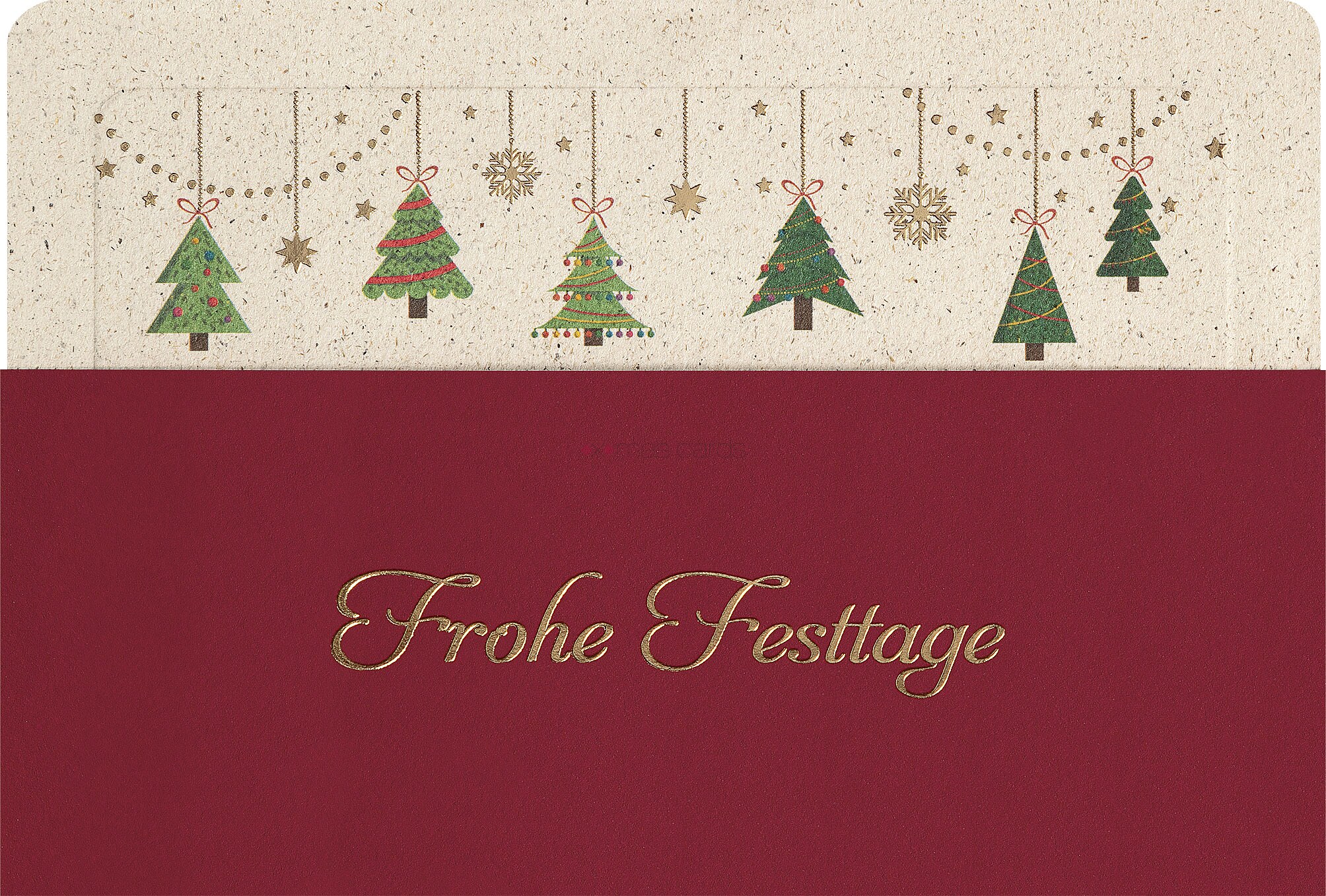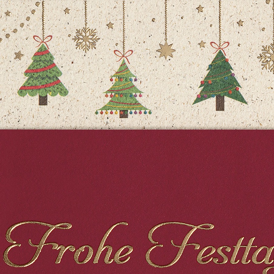 Stylische Weihnachtskarte aus bordeauxfarbenem, samtartigem Feinstkarton und Goldfolienprägung, mit eingesteckter 1-fach Karte aus Graspapier für individuell gestaltete Weihnachtswünsche.