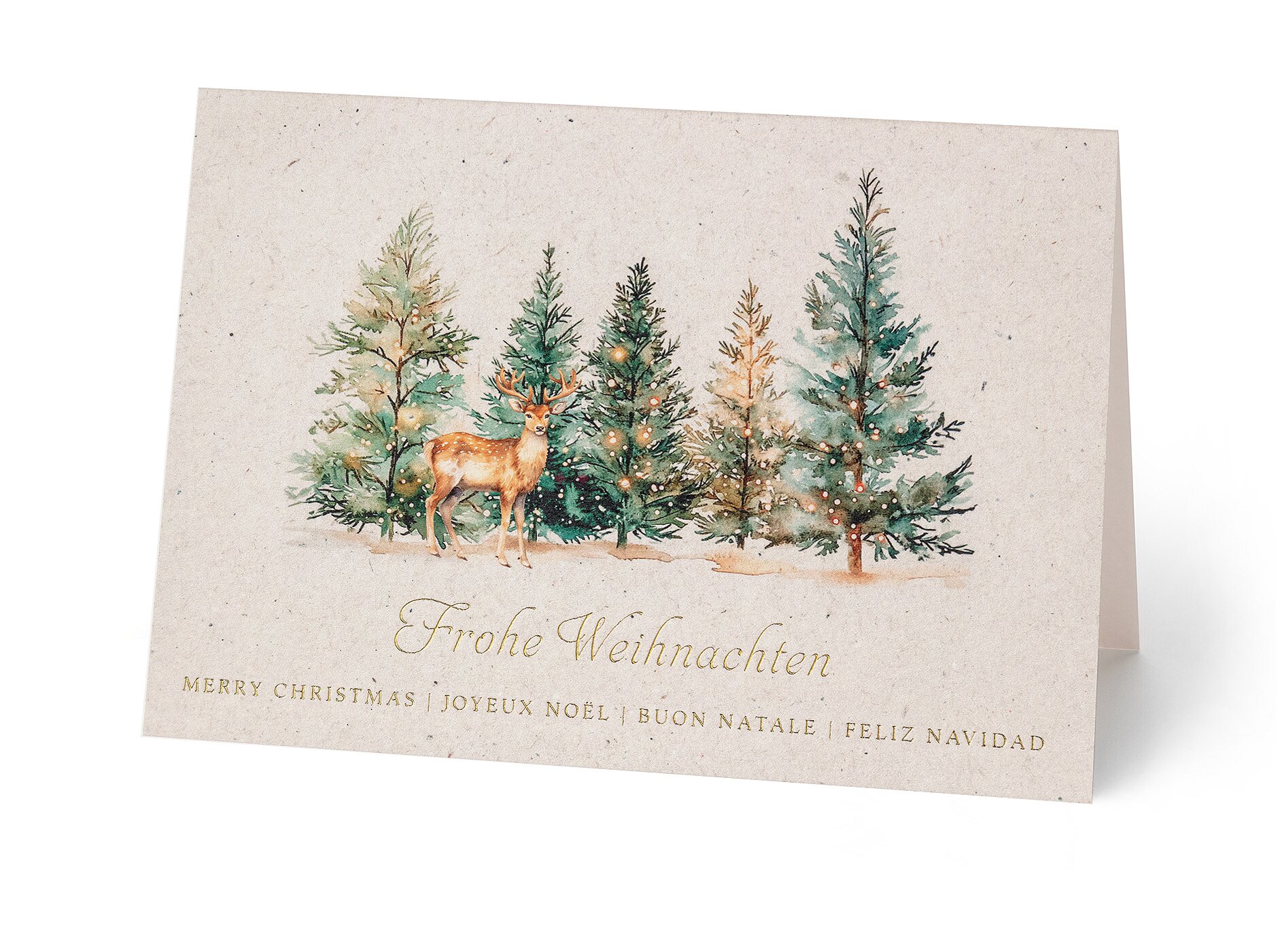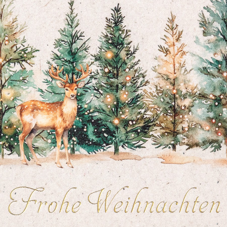 Eine bezaubernde Weihnachtskarte, die einen winterlichen Wald mit majestätischem Hirsch im Vordergrund zeigt. Dieser unterstreicht die ruhige und magische Stimmung der Jahreszeit. Im Tannenwald funkeln kleine Lichter, die der Karte ihren zarten Glanz verleihen und eine festliche Atmosphäre schaffen.
